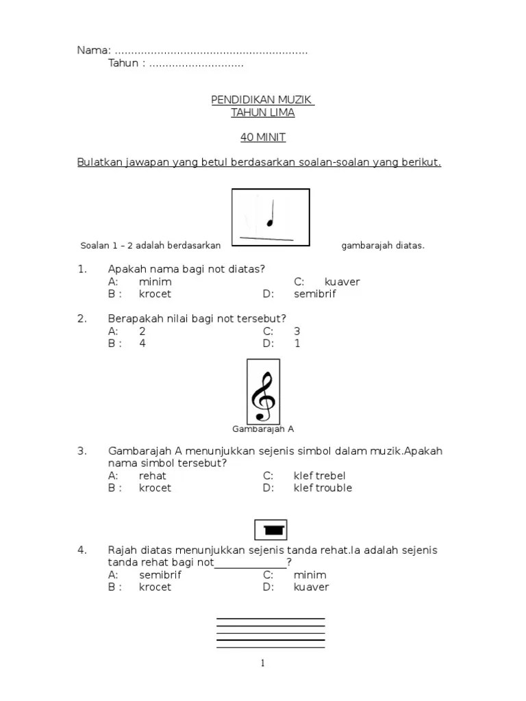 Video ini merupakan pengenalan not yang akan digunakan untuk tepuk irama dan menyusun not pada baluk bagi pendidikan muzik tahun 5. Setiap murid mengambil 4 buah tutup botol. Nama, nilai, simbol dan tanda rehat2. Pendidikan muzik tahun 5 mengenal not muzik simbol dan nilainya. Objektif pendidikan muzik tahun enam. Membaca, menama dan menulis simbol muzik, not, tanda rehat dan meter . Pilih simbol muzik yang mempunyai nilai 2 detik. Actividad de nilai not dan tanda rehat. Contohnya krocet, minim, semibrif dan kuaver. Pada setiap tutup botol ditulis jenis not dan tanda rehat. Mana satukah berikut ialah tanda rehat untuk semibrif? Video ini merupakan pengenalan not yang akan digunakan untuk tepuk irama dan menyusun not pada baluk bagi pendidikan muzik tahun 5. Masa senyap di dalam muzik dilambangkan dengan tanda rehat dalam bentuk atau simbol seperti. Murid dapat mengenal simbol, jenis not dan tanda rehat.kuiz : Penjarian rekoder tahun 5 worksheet.